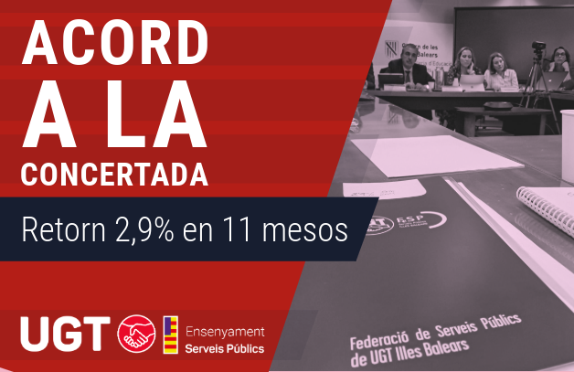 UGT Ensenyament Serveis Públics Illes Balears ha acceptat la darrera proposta de la Conselleria d’Educació per retornar el 2,9% retallat els anys 2020 i 2021 al professorat de l’ensenyament concertat mitjançant dos pagaments entre abril de 2026 i març de 2027, reduint així la calendarització inicial prevista de tres anys a només dos.