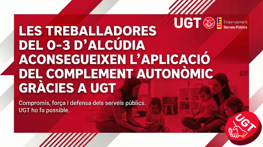 LES TREBALLADORES DEL 0-3 D’ALCÚDIA ACONSEGUEIXEN L’APLICACIÓ DEL COMPLEMENT AUTONÒMIC GRÀCIES A UGT febrero 11, 2026 Leer más »