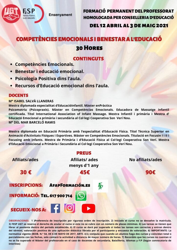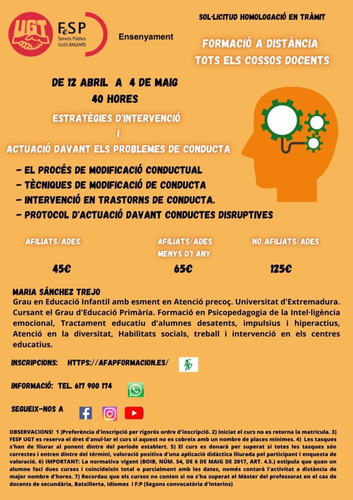 ESTRATÈGIES D’INTERVENCIÓ I ACTUACIÓ D’AVANT ELS PROBLEMES DE CONDUCTA (40 hores) marzo 18, 2021 Leer más »