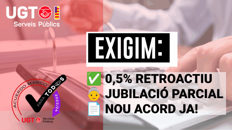 UGT i CCOO exigeixen al Govern el pagament immediat del 0,5% retroactiu, la recuperació de la jubilació parcial i l’obertura urgent d’un nou Acord per garantir millores en salaris i ocupació pública junio 11, 2025 Leer más »