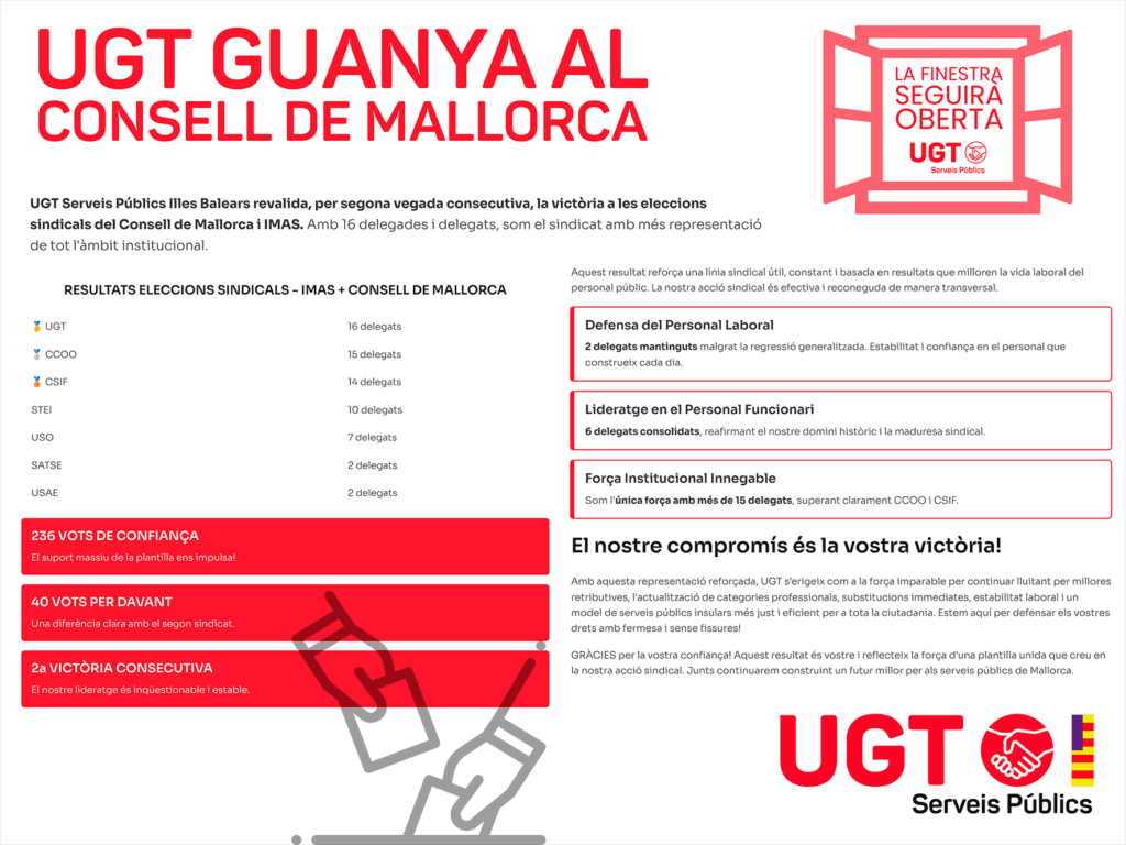 UGT Serveis Públics Illes Balears reafirma el seu compromís amb totes les treballadores i tots els treballadors del Consell i de l’IMAS: continuarem amb vosaltres, defensant cada dia els vostres drets.