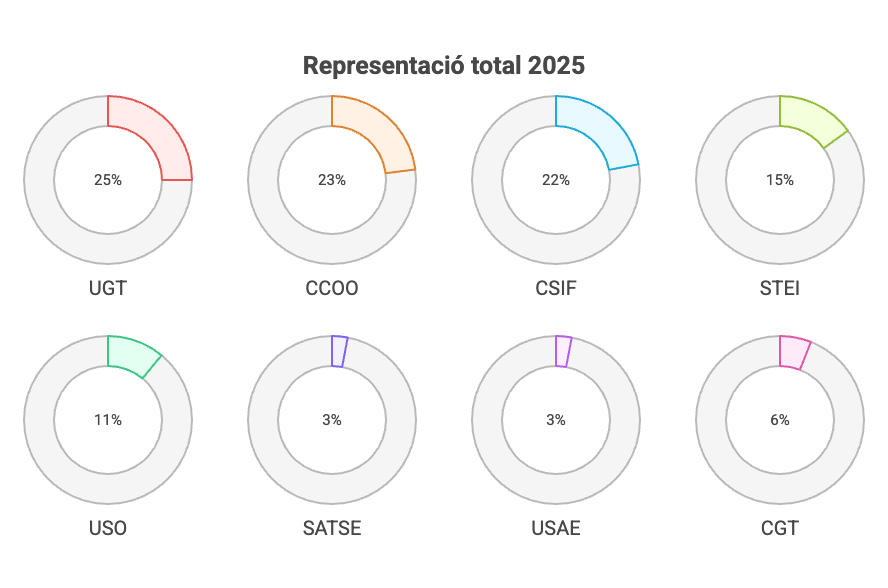 UGT és l’únic sindicat que supera els 15 representants, i això ens permet defensar amb més força els drets i interessos de totes les persones treballadores, tant dones com homes, de tots els serveis i perfils professionals.