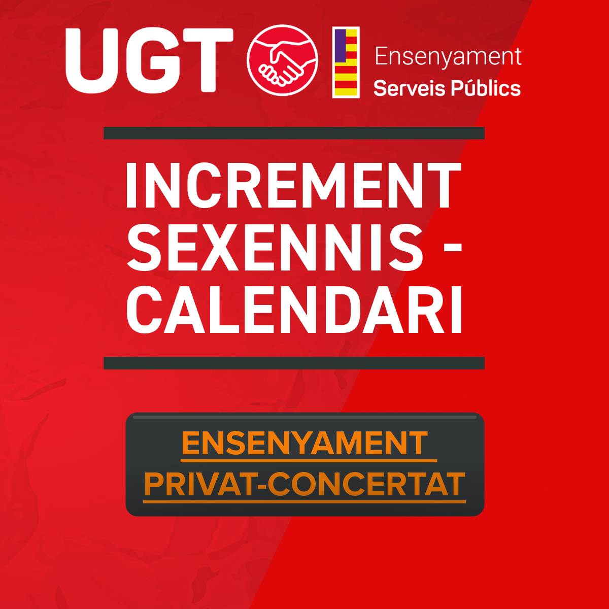 📢 A partir de gener de 2026 s’incrementa el % de cobrament dels sexennis a l’ensenyament privat concertat per donar compliment al que s’estableix en el pacte 5.8 del calendari per a l’abonament del 2n, 3r, 4t i 5è sexenni, de l’acord de reactivació de l’Acord de 2016 i Nou Acord Marc 2023-2027.