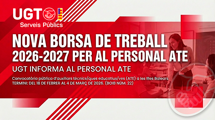 Avui s’ha publicat al Butlletí Oficial de les Illes Balears (BOIB núm. 22, de 17 de febrer de 2026) la Resolució de 13 de febrer de 2026 per la qual s’aprova la convocatòria pública per constituir una nova borsa de treball d’auxiliars tècnics/ques educatius/ves (ATE) per al curs 2026-2027