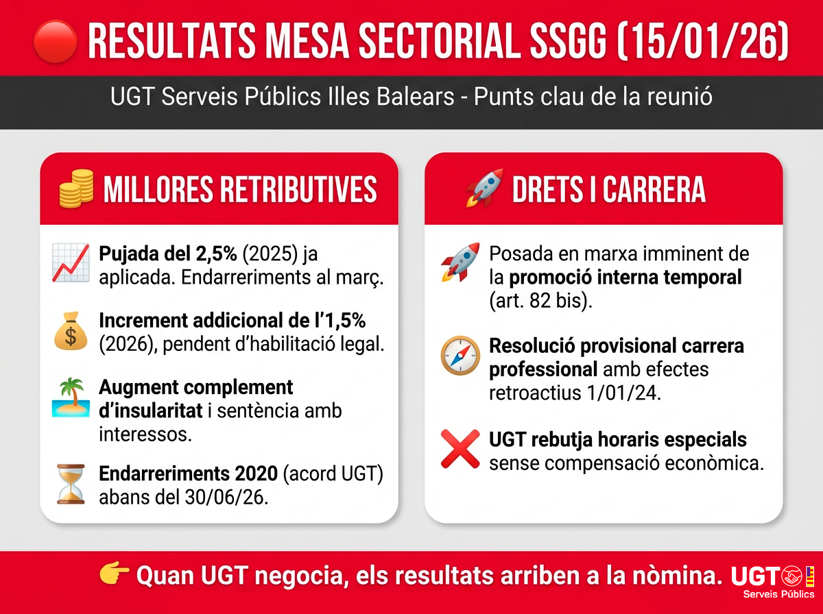 UGT Serveis Públics Illes Balears ha participat en la Mesa Sectorial de Serveis Generals del passat 15 de gener de 2026, una reunió determinant per continuar avançant en la millora de les condicions laborals i retributives del personal públic. La nostra prioritat és clara: transformar la negociació en drets reals i en més poder adquisitiu per als treballadors i treballadores.