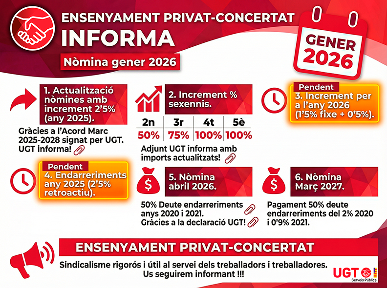 Aquest increment és fruit de l’Acord Marc 2025-2028 per a la millora de l’ocupació pública i el servei a la ciutadania, signat per UGT amb el Ministeri d’Hisenda i Funció Pública, que garanteix que el professorat de l’ensenyament privat-concertat percebi els mateixos increments que el conjunt del sector públic.